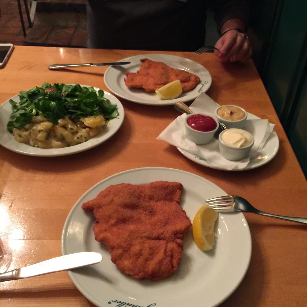 Prater’i de bitirdikten sonra artık yorgun argın otele dönme vakti. Akşam yemeğini Viyana’nın en ünlü şinitzel restoranı olan Figlmüller‘de yiyeceğiz. Yalnız aklınızda olsun öyle aklınıza esince Figlmüllere gelip de şinitzel yiyemiyorsunuz. Yaklaşık 3 hafta önceden internet üzerinden rezervasyon yaptırmanız gerekiyor. (Rezervasyonu bu linke tıklayarak yapabilirsiniz; https://figlmueller.at/en/) Biz de gelmeden yaklaşık 15 gün önce rezervasyon yaptırdık. Yiyecek olarak tabii ki şinitzel ve patates salatası aldık. Hatta tadına doyamadık bir daha aldık. Gerçekten de mükemmeldi (özellikle de patates salatası). Yalnız şinitzel standart olarak domuz etinden yapılıyor. Sipariş verirken tavuk ya da dana şinitzel istediğinizi özellikle belirtmelisiniz. Şinitzelin fiyatı 15 euro.