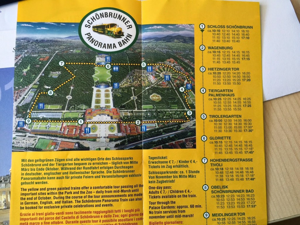 Schönbrunn Sarayının girişinde tüm bahçeyi gezdiren, istediğiniz durakta inip yine belli saatlerde istediğiniz durakta tekrar binebileceğiniz hop on hop off tarzı bir tren var. Ona binmenizi tavsiye ederim. Çünkü sarayın bahçesi gerçekten de çok büyük, hele bir de yorgunsanız yürüyerek gezmeniz zor. Tren için 7 euro verip gün boyu istediğiniz kadar kullanabiliyorsunuz.