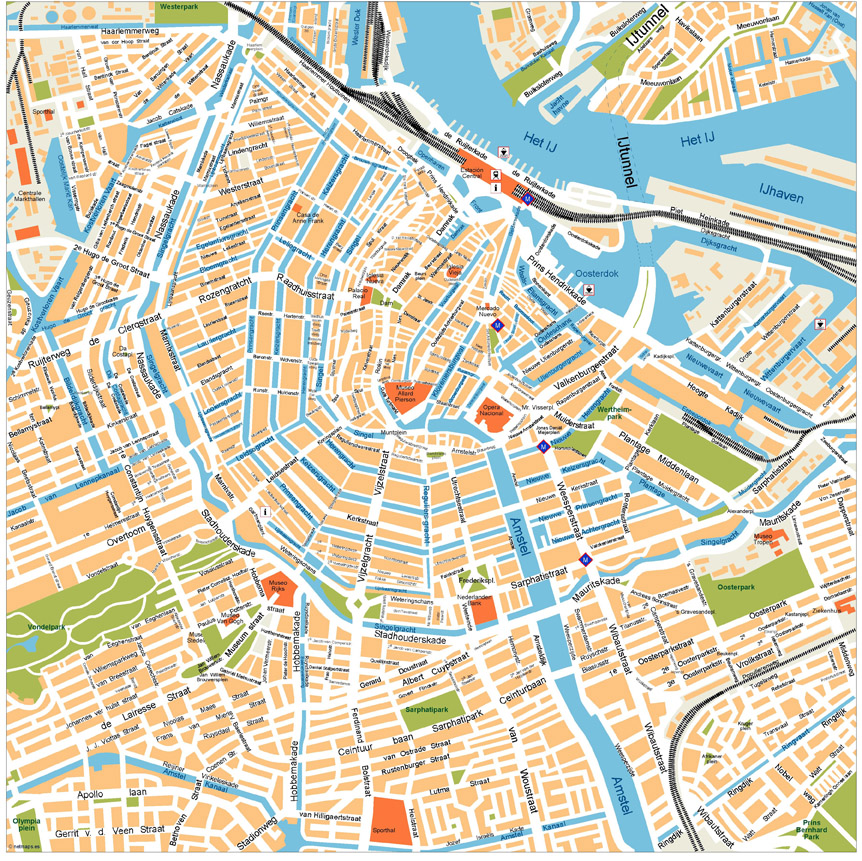 Gördüğünüz gibi Amsterdam, merkezinde Amsterdam Centraal Station’un bulunduğu 6 adet iç içe geçmiş ana kanaldan oluşuyor.