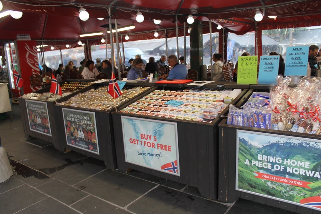 Bergen’in ünlü Balık Pazarı(Fisketorget), Torgallmenningen’e yürüyerek 3-5 dk mesafede (Kabaca meydanın sonu Balık Pazarı’na çıkıyor diyebiliriz). Balık Pazarı şehrin tam göbeğinde bulunuyor. Aklınıza gelen her türlü deniz ürününü, burgerden çorbaya kadar geniş bir yelpazede bulabileceğiniz bir pazar. Burada birşeyler alıp ayaküstü yemek en büyük turistik aktivitelerden biri. Deneyen arkadaşlar özellikle Norveç somonu yemeden dönülmemesi gerektiğini üstüne basa basa söylese de denizden çıkan hiç bir şeyi sevmeyen, dünyanın en ünlü ve en pahalı somonuna bile Bangkok’da çöp şişe dizilmiş akrep muamelesi yaparak burun kıvıran ben tabii ki hiç bir şey denemedim. Yalnız sokağın ortasında ayaküstü alıp yiyorsunuz diye fiyatları ucuz sanmayın. Fiyatlar lüks bir restoran kadar pahalı.