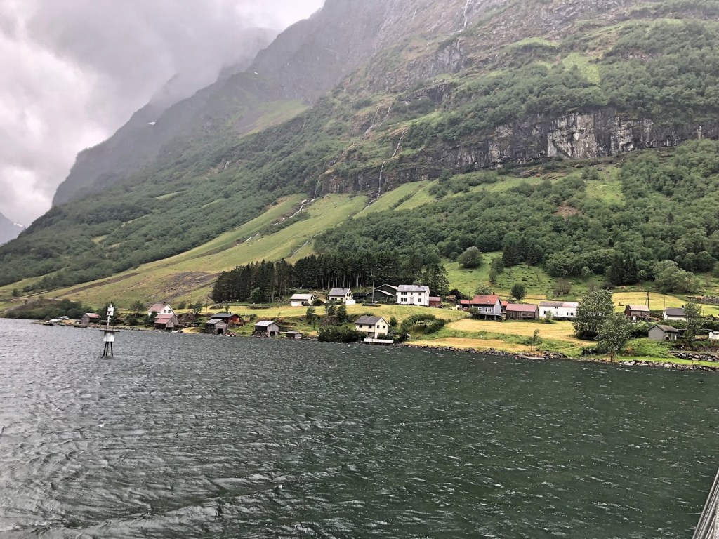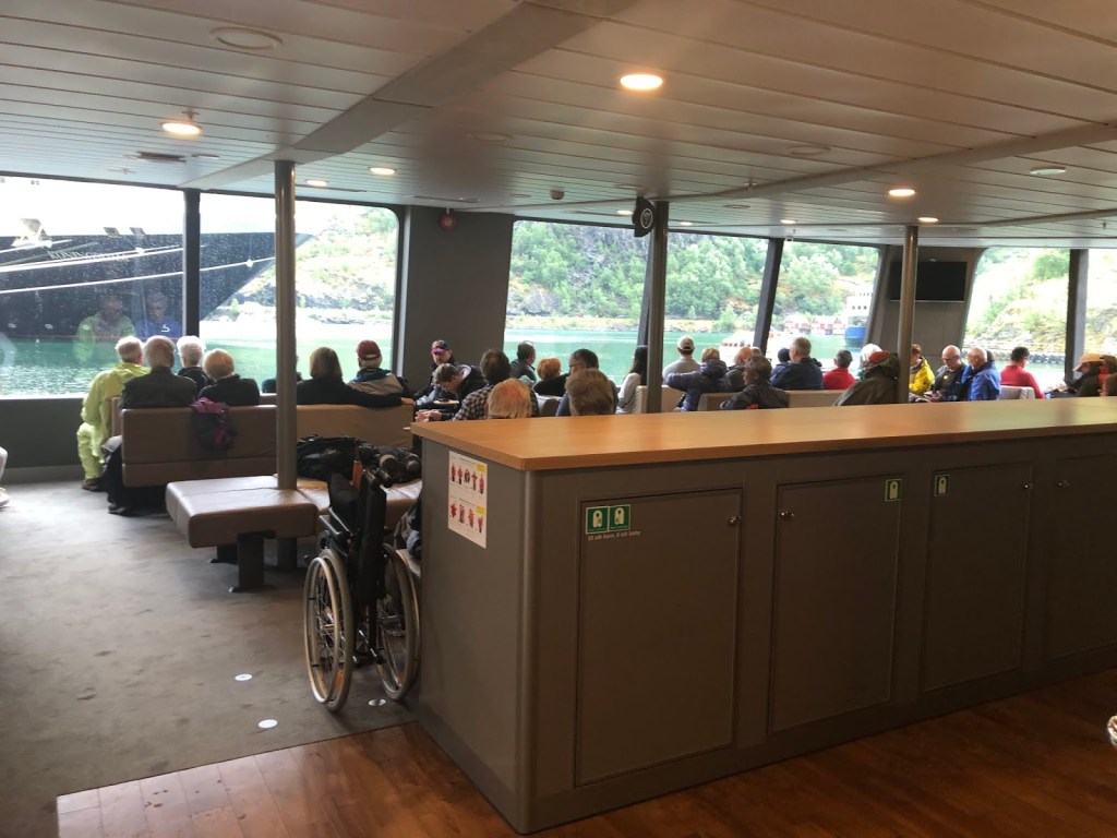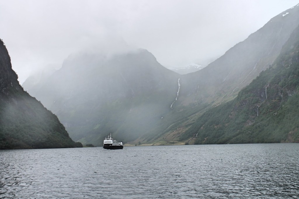 Naeroyfjord turu, Flam’da mutlaka yapılması gereken ikinci önemli aktivite. UNESCO Dünya Mirası listesinde bulunan Naeroyfjord, Norveç’in en uzun fiyordu Sognefjord’un bir kolu. Aynı zamanda Dünya’nın en dar fiyordu imiş kendileri. Naeroyfjord’un bir ucu Flam bir ucu ise Gudvangen. Dolayısıyla Naeroyfjord tekne turları da Flam-Gudvangen arasında oluyor. Az önce de bahsettiğim gibi gelmeden önceki planımız Flam-Myrdal arasını Flamsbana treni ile gidip bisikletle dönmekti. Ancak hava şartları buna izin vermediğinden tekrar trenle Flam’a döndük, yani hesapladığımızdan erken saatte dönmüş olduk. Biz tam Myrdal’dayken bir görevli arayıp daha önce web sitesinden almış olduğumuz Naeroyfjord turunun iptal edildiğini, istersek farklı bir saate bilet alabileceğimizi yoksa da bilet ücretinin kartımıza iade edileceğini söyledi. Biz de hazır vakit doğmuşken erken saate biletimizi değiştirmek için Flam’a iner inmez gişeye koştuk. Son anda kalkmak üzere olan tekneye yetiştik. Üstelik biletimizi premium tekneye update ettiler. O noktada şansımız işledi yani. Yalnız iyi ki de böyle oldu çünkü premium tekneler gerçekten de diğerlerine göre çok daha güzel ve konforlular. Tekne tamamen camlarla çevrili. Nereye oturursanız oturun manzarayı rahatlıkla seyredebiliyorsunuz. Bu durum hava güzelse çok önem arzetmiyor ama bizim gibi soğuk ve yağışlı havaya denk geldiyseniz bu tekneler hayat kurtarıcı olabiliyor. Dışarısı buz gibiyken siz elinizde kahveniz sıcacık koltuğunuzda manzarayı izleyebiliyorsunuz. Bu tekneler Flam ya da Gudvangen kalkışlı olabiliyor. Flam’dan Gudvangen’e tekne turunuzu yaptınız. Gudvangen’den Flam’a otobüsle ya da yine tekne ile geri dönebilirsiniz. Eğer çok vaktiniz yoksa otobüsle dönmeniz daha iyi olur. Otobüsle Flam’a dönmek 20 dk, tekrar tekne ile dönmek ise aynı Gudvangen’e gelirken olduğu gibi 2 saat sürüyor.