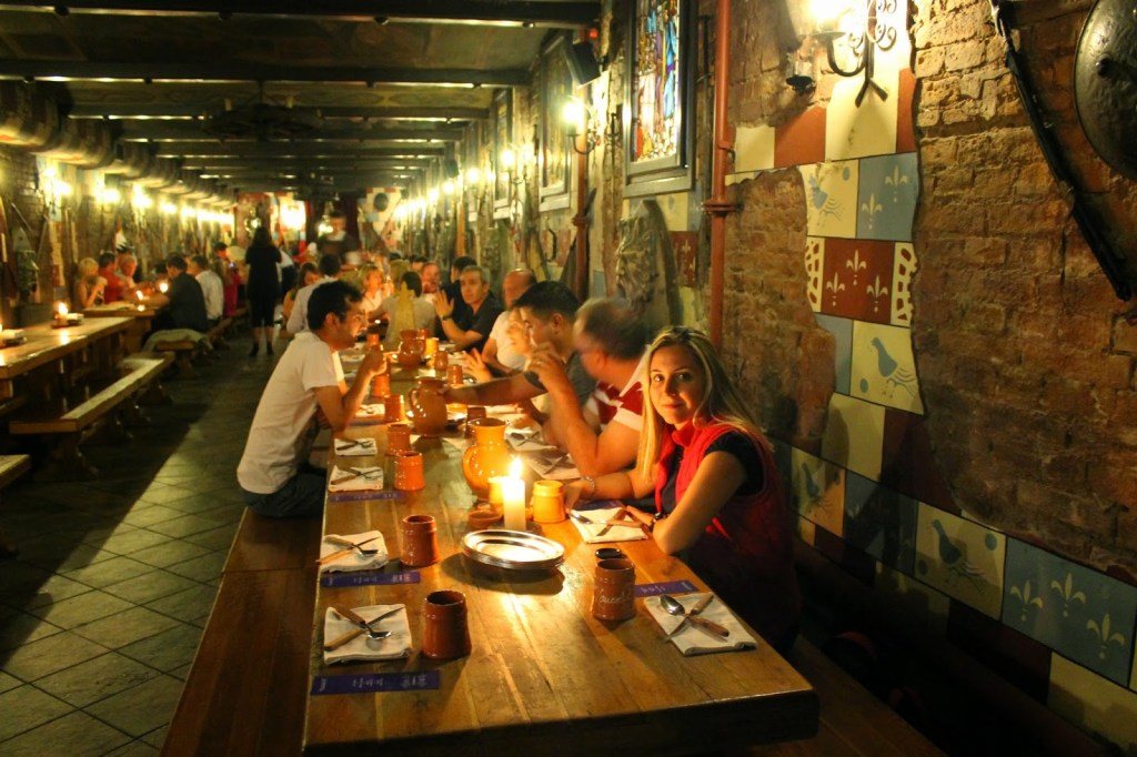 Budapeşte’ye gelmişken yapmanız gereken en önemli şeylerden biri de Orta Çağ Gecesi. Biz bunun için ikinci gece Sir Lancelot‘u tercih ettik. Budapeşte gezimizdeki şüphesiz en zevkli anlardan biriydi. İçeri girdiğinizde kendinizi orta çağda hissetmeniz için tüm şartlar sağlanmış. Çalınan müzikten, kullandığınız bardaklara, garsonların kıyafetlerinden gösterilere kadar her şey harika. Masaya oturduğunuzda yemeğinizi kibar kibar çatal bıçakla yiyeceğinizi sanıyorsanız yanılıyorsunuz. Öyle çatal bıçak falan yok, Erol Taş gibi eti elinizle yiyorsunuz. Önünüze bir önlük veriliyor. Bardaklar ve sürahiler o dönemde nasıl kullanılıyorsa öyle. Kısacası hem yemekler hem ortam hem de gösteriler çok iyiydi. Listeye ortaçağ gecesini ekleyin, mutlaka yapılması gerekenlerden.