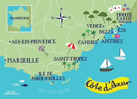 Fransız Rivierası olarak da bilinen Cote d’Azur, Fransa’nın güneyinde Marsiya’dan Menton’a kadar olan 200 km lik sahil şerididir. İsmini Stephan Liegeard’ın 1887 yılında yayınladığı “La Cote d’Azur” kitabından alıyor. Pop yıldızlarından Hollywood ünlülerine kadar bir çok popüler isim tatil için bu bölgeyi tercih ettiğinden Rivieranın ismini son dönemlerde sık sık duyuyoruz. Gerçekten de yeşilin her tonunu barındıran bir doğası ve muhteşem güzellikte kıyıları var. Bunlara bir de korunmuş bir tarihi doku ve mimari eklenince ortaya gezmelere görmelere doyamayacağınız görüntüler çıkıyor. Tabii misafirleri bu kadar ünlü ve zengin olunca ister istemez Cote d’Azur da pahalı bir destinasyon haline gelmiş oluyor.