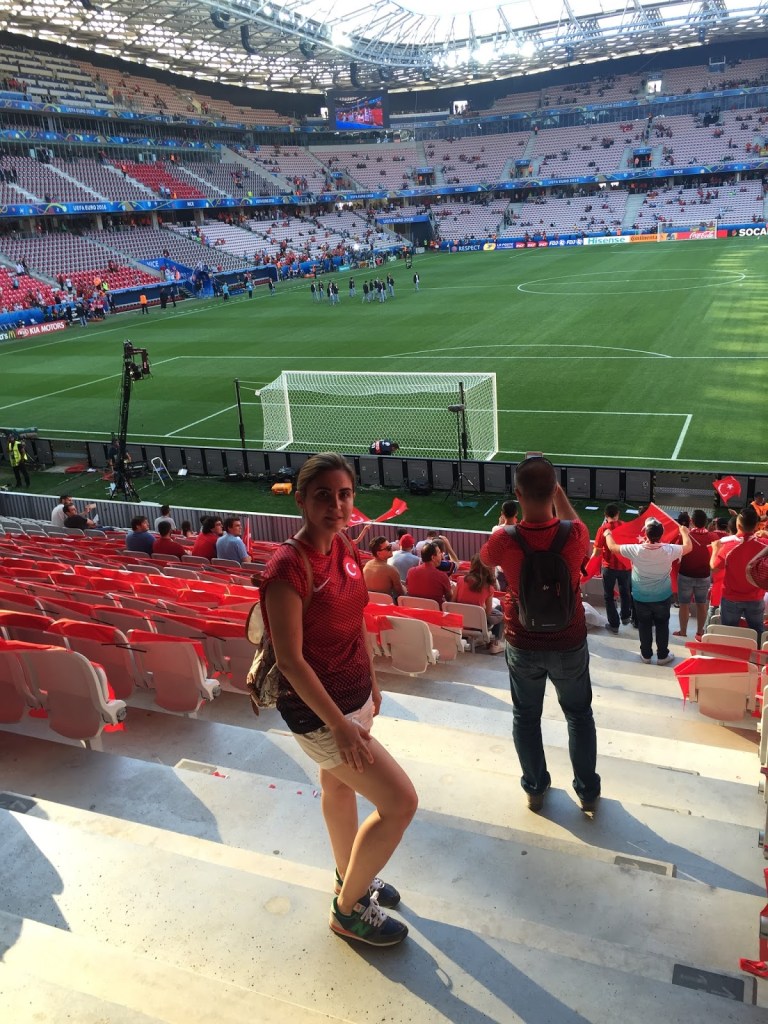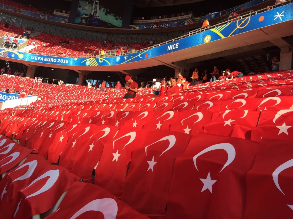 Bileti de aldıktan sonra sıra geldi maça gitmeye. Maça gitmek için 3 euro verip Stat de Nice yani Allianz Riviera’ya gitmek için otobüs bileti aldık. Farkında olmadan coşkulu ispanyol taraftarlarının olduğu otobüse binmişiz. Stada gidene kadar bütün ispanyol marşlarını ezberledik resmen, kafamız şişti. Otobüs güvenlik nedeniyle stadın 1-2 km dışında bıraktı bizi, burada da türk ve ispanyol taraftarlar ayrı yollardan stada gitti. Stada girdiğimizde TFF’nun türk tribünlerinin hepsini kırmızı beyaz bayrağımızla donattığını gördük, gerçekten de görüntü harikaydı. Ayrıca türkiyeden gelen Es-es bandosunun da katkılarıyla maç boyunca bayağı bir coştuk. Kısacası ortam çok eğlenceliydi her şey harikaydı. İspanya’dan şu 3 golü de yemeseydik iyiydi :((