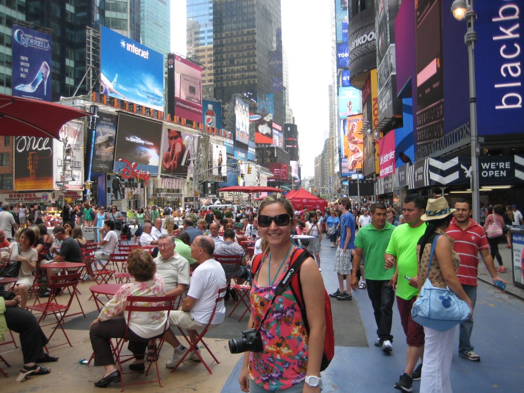 Otel odasına yerleşir yerleşmez ilk işimiz şu 24 saat uyumayan Time Square’yi bir kolaçan etmek oldu. Hani dedik ya Manhattan NYC’nin merkezi diye, işte 7. avenue ile 47. street’in birleştiği noktada bulunan Time Square de Manhattan’ın kalbi. Hangi saat gelirseniz gelin kalabalık, tıklım tıklım. Etraftaki meşhur neon ışıkları nedeniyle gecesi de adeta gündüz gibi, ışıl ışıl. Burada her tipte insanı görmek mümkün. Ayrıca 5 dolar bahşiş karşılığında Özgürlük Anıtı ile ya da Mickey Mouse ile de fotoğraf çektirebilirsiniz. Tabii Time Square’ye geldiğinizde dikkatinizi çekecek upuzuuuuuun bir sıra var. Bu sıranın ucu nereye varıyor diye baktığınızda insanların fotoğraf çektirmek için adeta kapıştığı kırmızı merdivenleri göreceksiniz. Eğer vaktiniz ve enerjiniz varsa bu uzun sıraya siz de katılıp eğlenceli bir deneyim yaşayabilirsiniz. Bu arada Time Square’de birbirinden güzel cafeler ve mağazalar bulunuyor. Yerinizde olsam Hard Rock Cafe’yi ve Bubba Gump’ı özellikle denerdim. Yine aklımdayken belirteyim Brodway müzikalleri için ucuz bilet bulabileceğiniz TKTS gişelerinden biri bu meydanda bulunuyor (diğeri ise daha sonra bahsedeceğim South Street Seaport’ta yer alıyor.) Benim orada olduğum dönemde en ünlü müzikal Lion King idi, hala daha da öyle. Ancak Lion King’e ucuz bilet bulmayı beklemeyin sakın 🙂