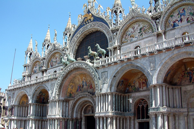 Meydandaki en önemli yapı şüphesiz San Marco Bazilikası. Bu ünlü bazilika tasarlanırken İstanbulumuzun gözbebeği Ayasofya örnek alınmış. Bazilikanın önüne geldiğinizde ilk yapmanız gereken başınızı kaldırıp yukarı bakmak. Baktığınızda bazilikanın şaşaalı girişinin hemen üstünde 4 tane at heykeli göreceksiniz. İşte bunlar San Marco’nun en az kendisi kadar meşhur olan atları (ancak hemen heyecana kapılmayın çünkü gördükleriniz maalesef orijinali değil, kopyası. Yaklaşık 40 yıl önce orijinalleri korumaya alınmış). Öyle ki yüzyıllar boyunca bu atlar devletler arasında bir türlü paylaşılamamış, resmen kapanın elinde kalmışlar. Atların orijinallerini görmek için bazilikanın içerisinde ayrıca bir müzeye girmeniz gerekiyor, Museo Marciano. Bu müzenin girişi 6 euro. San Marco Bazilikasının girişi ise ücretsiz (hafta içi her gün saat 9.00-17.00 arası, cumartesi ve tatil günleri ise saat 14.00-16.00 arası açık), ancak Venedik gibi bir yerde, turistin en yoğun olduğu zamanda tahmin edersiniz ki içeri girmek için bayağı bir beklemek zorunda kalıyorsunuz.
