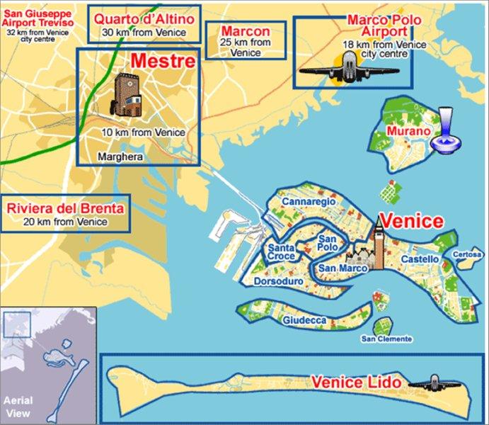 Venedik İtalya’nın kuzeydoğusunda yer alıyor. Bizler turist olarak merkez Venedik’i, yani tarihi Venedik kısmını geziyoruz. Ancak Venedik buradan ibaret değil. Çevresindeki irili ufaklı 120 adet ada ve Mestre denen ana kara kısmı var. Ama dediğim gibi bizim de asıl gezeceğimiz turistik olan kısım Eski Şehir bölgesi.