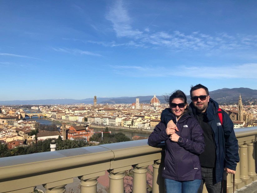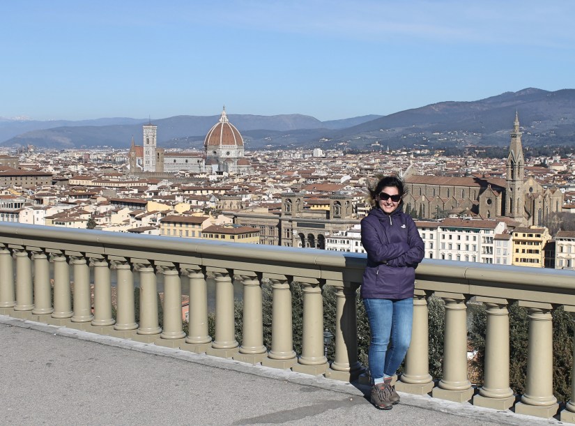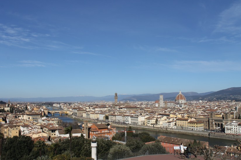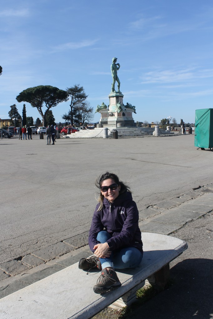 Bugünün ilk durağı Floransa’yı ayaklarımızın altına serecek olan Michelangelo Tepesi(Piazzale Michelangelo). Şehir içi ulaşım kısmında da bahsetmiştim; Foransa’da toplu taşıma ya da taksiye ihtiyaç duyacağınız tek yer burası. Bana kalsa havanın güzel olduğu bir günde yürüyerek çıkmayı tercih ederdim ancak sabah inanılmaz rüzgarlı ve soğuk bir güne uyandığımızdan Michelangelo Tepesi’ ne taksiyle gitmek zorunda kaldık. Aslında otobüs kullanmak istemiştik ama sanırım otobüs saatlerinde o gün için bir karışıklık oldu çünkü durakta bayağı bir beklememize rağmen otobüs bir türlü gelmedi. Biz de paramıza minnet deyip taksiye bindik ama bu kararı alırken çok da fevri davranmamak gerektiğini anladım çünkü taksimetre gözümüzün önünde acımasızca attı durdu. O gün şansımıza trafik de biraz yoğundu. Bize biraz pahalıya mal oldu ama ne yapalım artık. Michelangelo Tepesi için SMN tren istasyonu önünden hareket eden 12 ve 13 no lu otobüsleri tercih edebilirsiniz. Benim size tavsiyem yürüyerek çıkıp inmeniz. Ama o kadar yokuş çıktıktan sonra günün geri kalanına yorgun devam etmek istemiyorsanız bizim gibi toplu taşıma ya da taksiyle çıkıp yürüyerek inin bence. Böylesi çok daha keyifli oluyor.