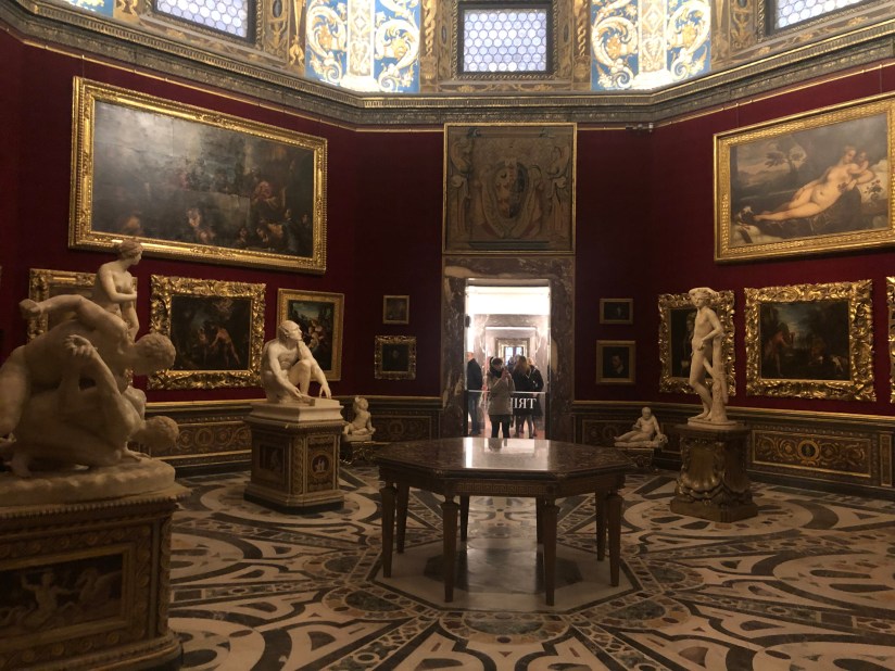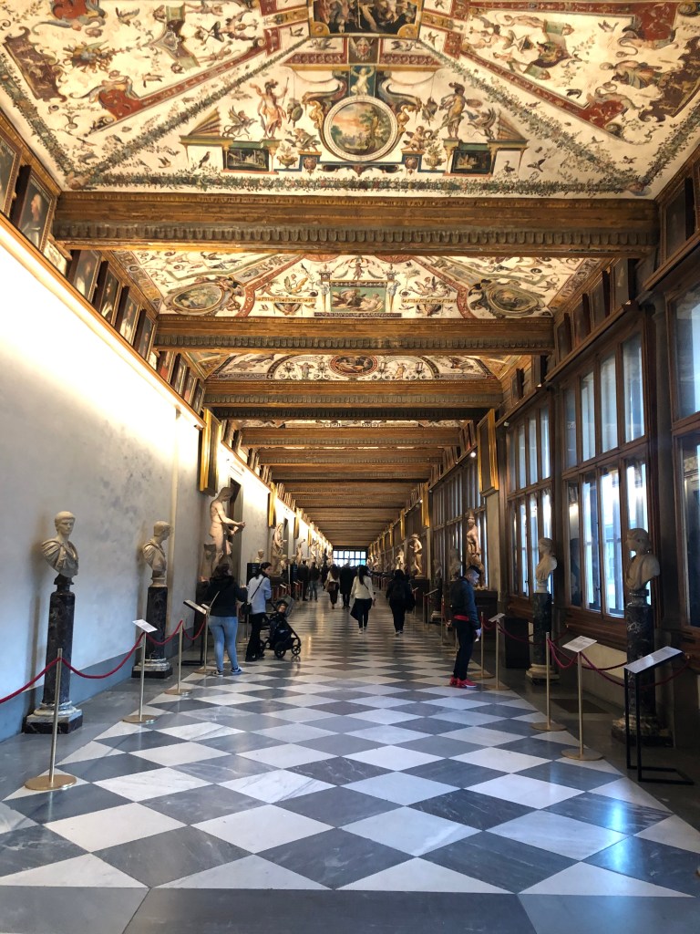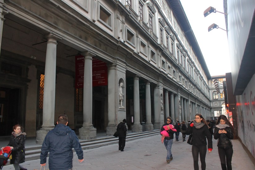 Bugünki son durağımız Uffizi Galerisi. Aslına bakarsanız Uffizi’yi bugüne dahil etmemiştik. Ancak normalde önünde uzun kuyruklar görmeyi beklediğimiz bilet gişesini bomboş görünce dayanamayıp girdik. Bizden sonra da gişe kapandı zaten. Şansımıza müzenin içi de çok sakindi, rahat rahat gezebildik. Floransa’da bir çok müze bulunmasına rağmen iki tanesi özellikle önem arzediyor; Uffizi Galerisi ve Galleria Della Accademia. Vaktiniz varsa ikisini de gezmenizi öneririm. Ama yeterince vaktim yok diyorsanız da en azından bir tanesini görmeye çalışın. Bizim de vaktimiz kısıtlı olduğundan ikisi arasından Uffizi’yi tercih ettik. Uffizi için Dünya’nın en geniş sanat koleksiyonuna sahip müzelerden biri desek yalan olmaz. Herşeyi tek tek inceleyerek hakkıyla gezmek isterseniz 1 tam gün bile yetmeyebilir. Hızlıca bir bakışla bile en az 2-3 saatinizi ayırmalısınız. Uffizi Müzesi, Vatikan Müzeleri ile birlikte İtalya’da en çok ziyaretçi alan müzeymiş. Dolayısıyla önündeki kalabalığı tahmin edebilirsiniz. İşte bu upuzun kuyrukta sıra beklememek için buraya tıklayarak biletinizi online olarak almalısınız. Uffizi Galerisi’nin giriş ücreti 12 euro. Ancak sıra beklememek için online rezervasyon yaptığınızda 4 euro fazladan ödemeniz gerekiyor ki, bence bu 4 eurodan kısmayın, sonuna kadar hakkını veren bir 4 euro çünkü. Bunun dışında Firenze Card’ınız varsa yine hızlı geçiş hakkına sahipsiniz. Son olarak da Uffizi’nin Pazartesi günleri kapalı olduğunu belirtmek istiyorum.