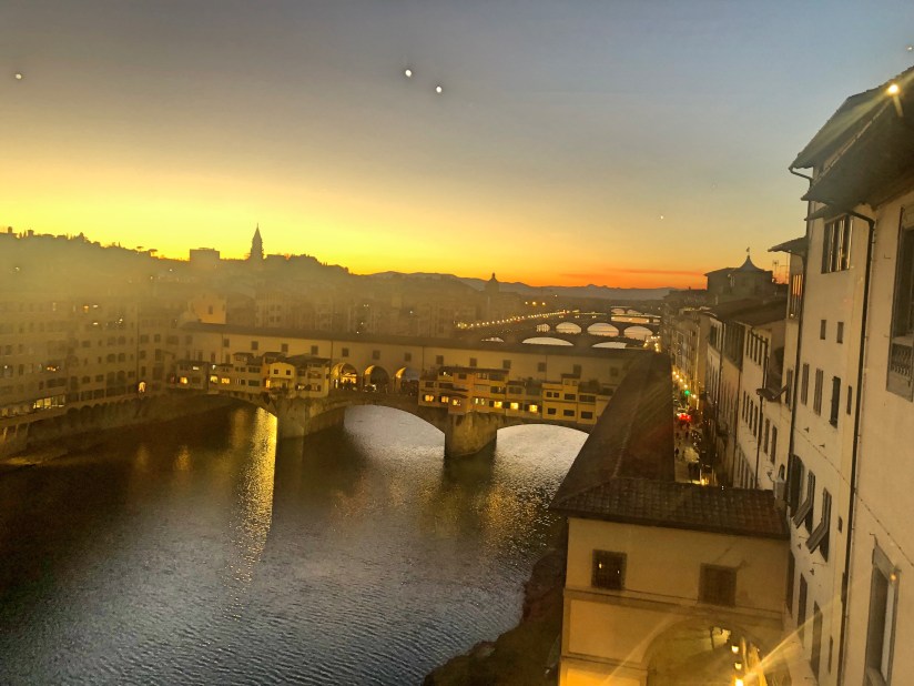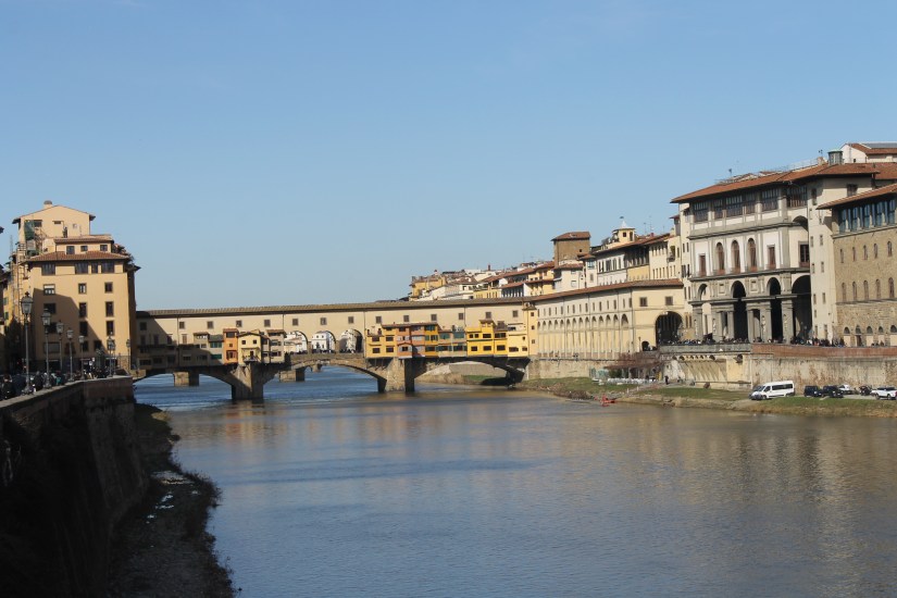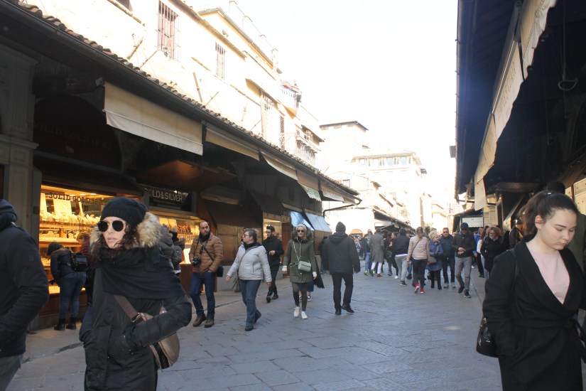 Yine yürüyerek Floransa’nın en önemli simgelerinden biri olan Ponte Vecchio’ya yani Vecchio Köprüsü’ne geçiyoruz. Floransa için Duomo neyse bu köprü de o. Arno nehrinin en dar yerine yapılan bu köprünün tarihi Roma İmparatorluğuna kadar gidiyor. Bir çok kez yangınlardan sellerden zarar görüp yeniden yapılmış. Son hali ise Neri di Fioravante tarafından 1345 yılında inşa edilmiş. Bir dedikoduya göre Adolf Hitler bu köprüyü o kadar çok sevmiş ki 2. Dünya Savaşında Floransa’da diğer köprüler yerle bir olurken ayakta kalan tek köprü burası olmuş. İlk zamanlar köprüdeki dükkanlarda demirciler, dericiler ve kasaplar bulunuyormuş. Ancak kötü koku ve gürültü nedeniyle 1500’lerin sonunda I. Ferdinand tarafından kapatılmışlar. Sonrasında dükkanlar yeniden inşa edilerek kuyumculara kiralanmış. Günümüzde de hala kuyumcular ve hediyelik eşya satan dükkanlar bulunuyor.