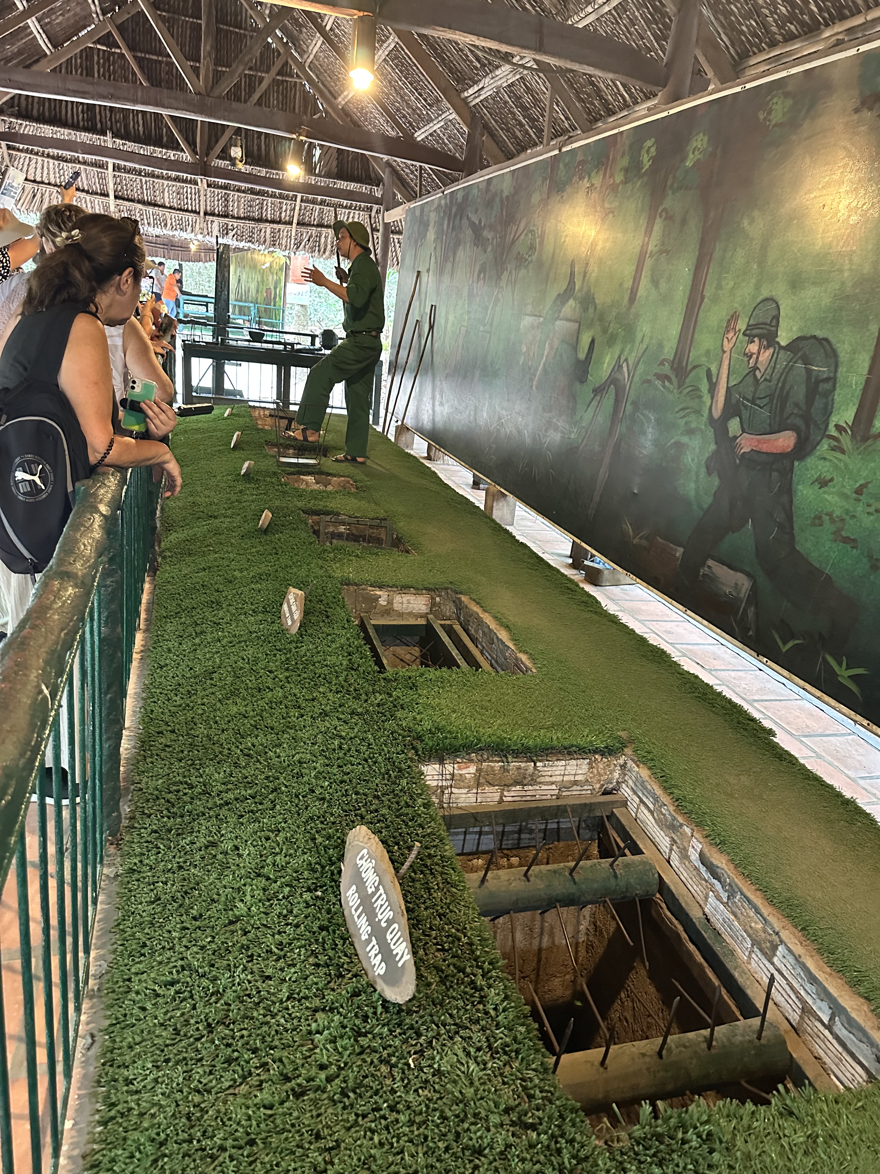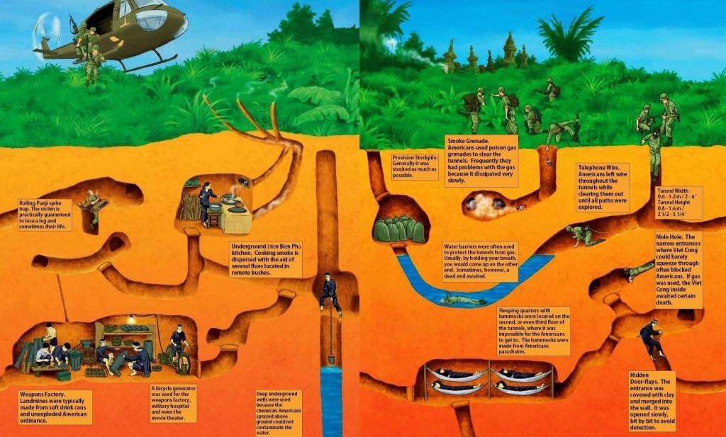 Tünel dediğim basit bir yapı değil. Taa Kamboçya sınırına kadar varan 200 km uzunluğunda 3 katlı, içinde yatakhanesi, yemekhanesi, sosyal alanları ile tam bir yaşam kompleksi. Vietnamlılar ufak tefek oldukları için tünellere bu kadar iyi uyum sağlayabilmişler. Tünellerin girişi üzeri kamufle edilmiş gizli kapılardan sağlanıyor. Tünellerin bulunduğu alan düşman askerleri içinse tam anlamıyla bir cehennem çünkü ormanın her yeri garip tuzaklarla çevrelenmiş durumda. Yüzbinlerce düşman askerinin burada hayatını kaybettiği söyleniyor.