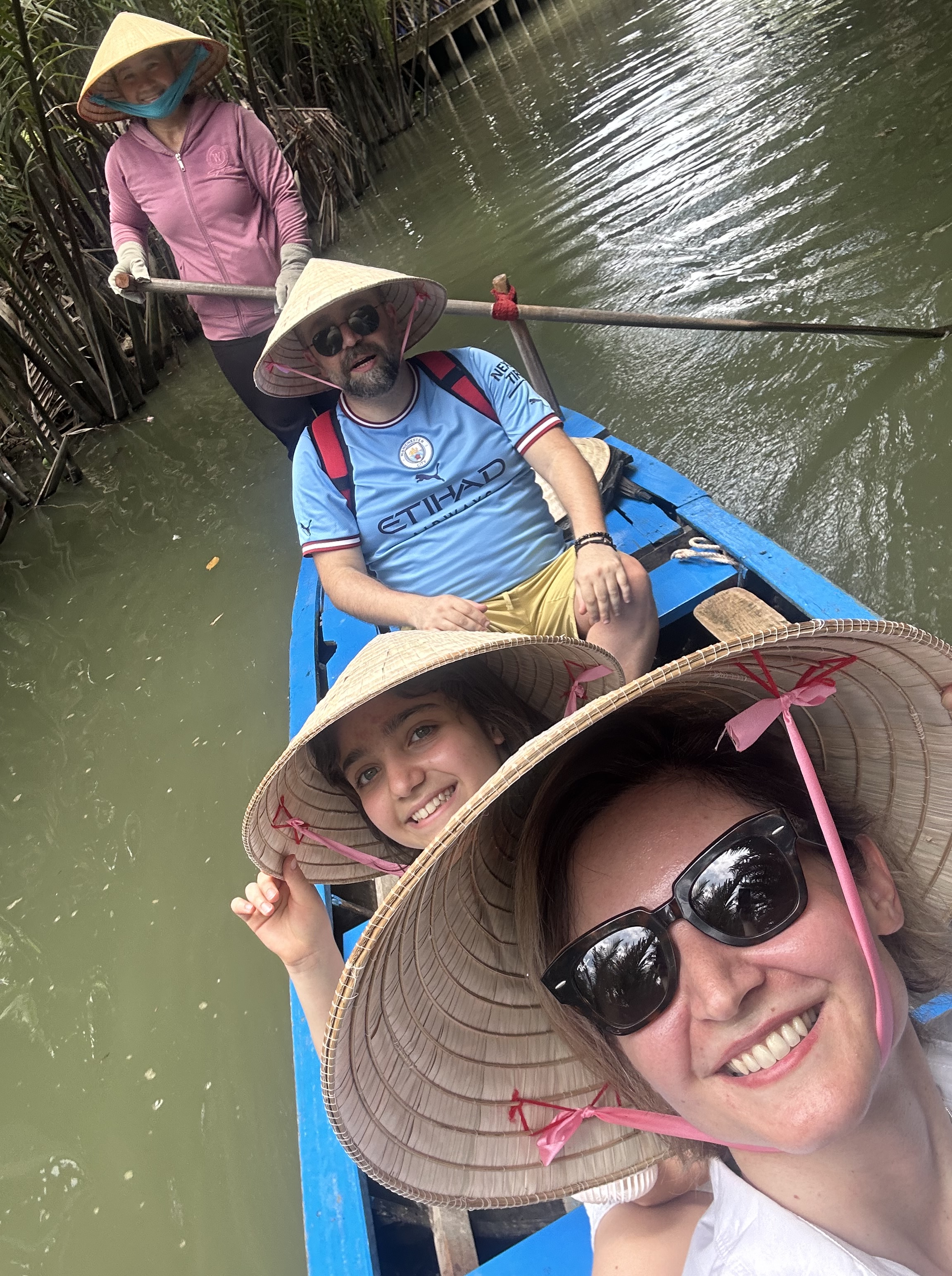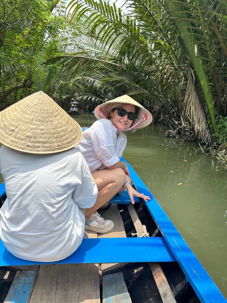 Başımızda Vietnam’ın meşhur konik şapkalarıyla küçük kanomuza binerek, kocaman yeşilliklerle kaplı nehirde yaptığımız gezinti ise günün top noktasıydı. Bir kano 4-5 kişi alıyor. Şapkaları bindiğiniz zaman kanoda veriyorlar. Aşağı yukarı 20 dakikalık kısa bir gezinti ama gerçekten çok zevkli.