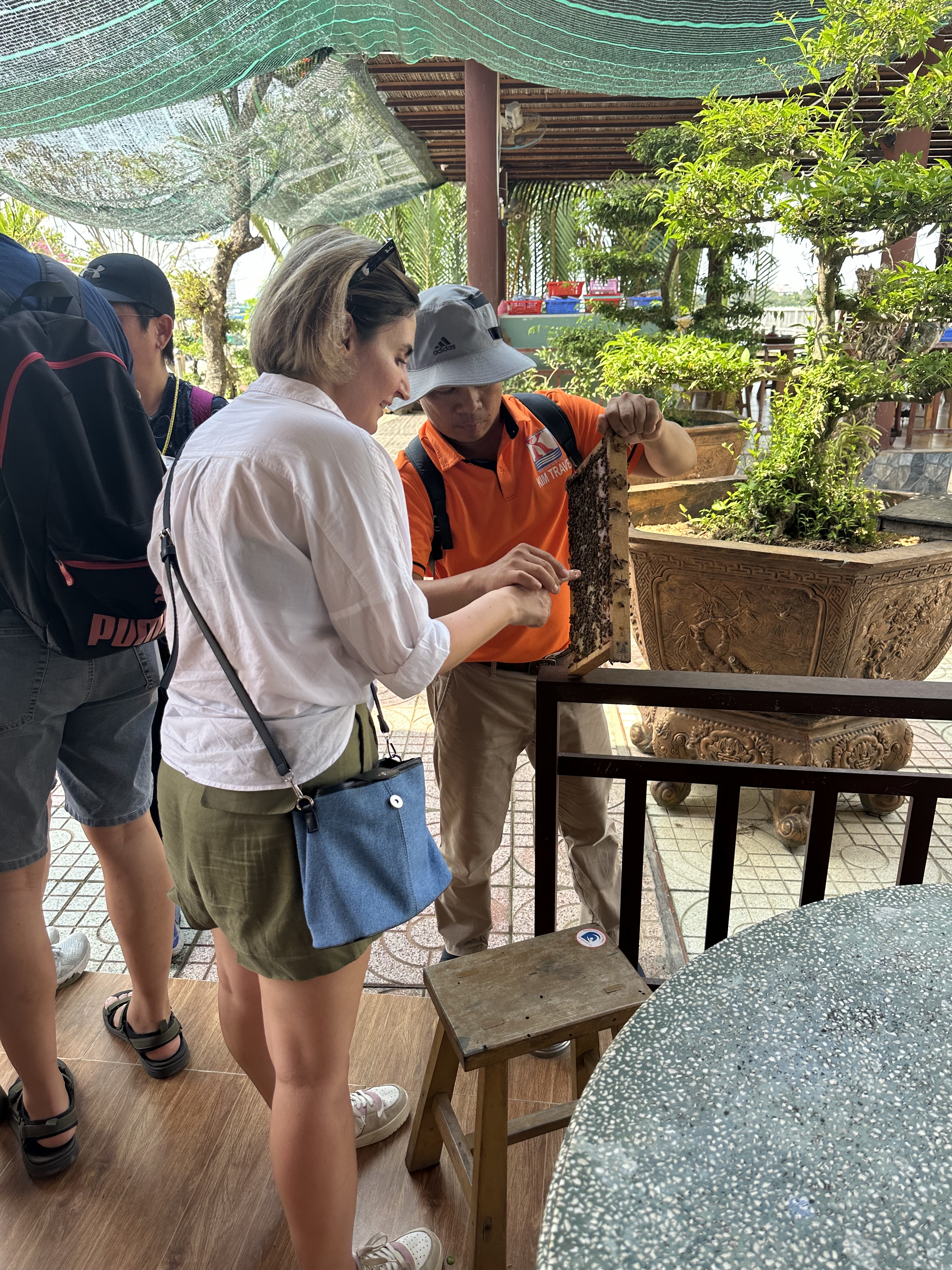En sonda, artık dönüş için teknemizi beklediğimiz noktada ise meşhur Vietnam balı ve çayı ikram ediliyor. İsterseniz bunlardan satın alabiliyorsunuz. Yalnız buradan içeri adım atar atmaz rehberimiz gidip eski bir sandıktan kocaman bir yılan çıkararak gruptaki herkesin boynuna atmaya çalıştı. İçeri geçince de arılarla dolu bir kovanı getirip parmağımızı kovanın içine daldırmaya çalıştı. Yılandan deli gibi korktuğum için hiçbir şekilde oyuna gelmedim ancak nasıl olduysa, seyahatlerinde sıfır risk alma felsefesi benimseyen beni gaza getirdi ve kendimi yüzlerce arının bulunduğu bir kovana parmak daldırırken buldum. Tabi ki beklenen gerçekleşti ve parmağımı arı soktu. Oysa ki ben bu arıların ya da yılanın ilaçla uyuşturulmuş oldukları gibi bir düşünceye kapılmıştım. Bunun verdiği güven duygusuyla böyle manasız ve saçma bir harekette bulunmuştum. Ama öyle değilmiş. Yani demek istediğim gaza gelmeyin. Arı sokarsa, ya da boynunuzdaki yılan kendini kaybedip de sizi boğası gelirse kendinizle baş başa kalıyorsunuz, kimse bir şey yapmıyor söyleyeyim. Öyle profesyonel bir ortam yok yani. Mesela arı soktuğunda elime getirip vazelin gibi bir krem sürdüler o kadar. Yani alerjim falan olmuş olsaydı orada balon gibi şişip kalmıştım.