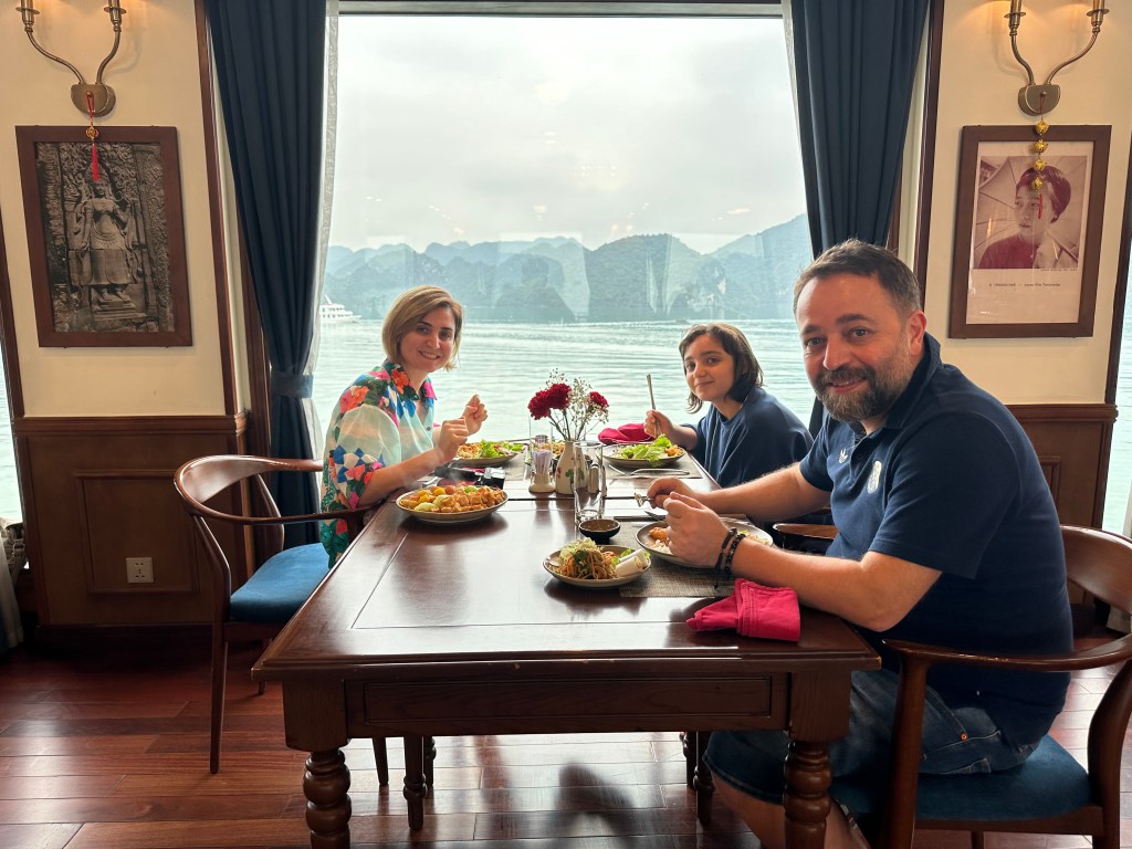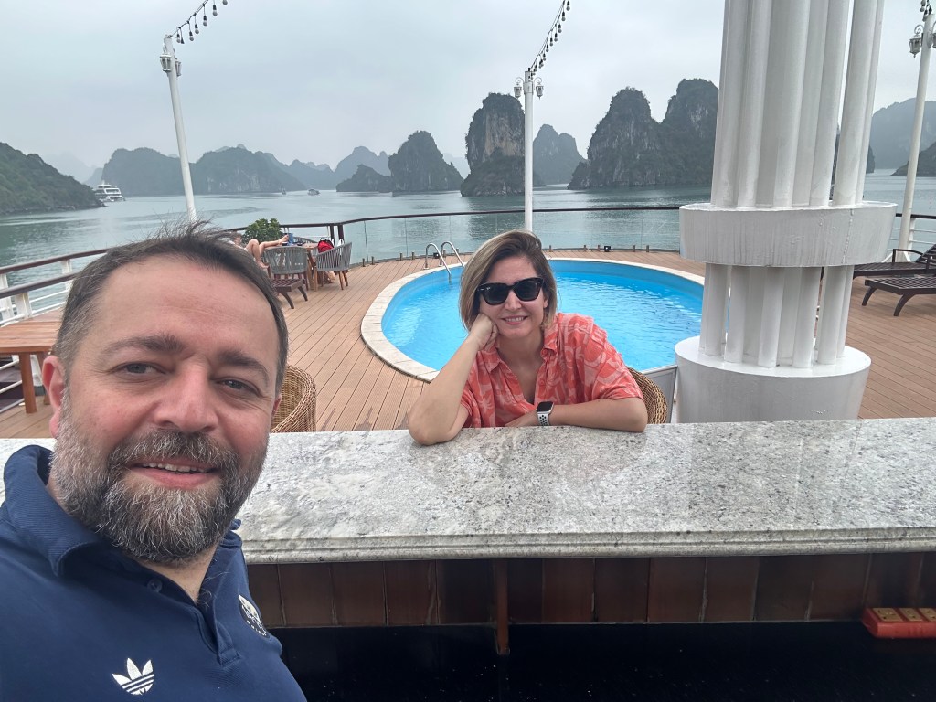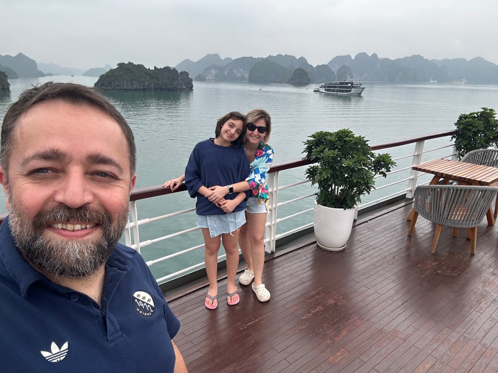 Bize gelince biz bir gece konaklamalı her şeyiyle muhteşem bir tekne tercih ettik; Heritage Cruises. Sabah saat 7 gibi transfer gelip bizi otelimizden aldı. Yaklaşık 3-4 saatlik bir yolculuktan sonra Ha Long Bay limanından küçük bir tekneyle yarım saatte ana teknemiz olan Heritage’ye ulaştık. Tekne personeli ile tanışma, teknenin bize tanıtılması, odalara yerleşme, öğle yemeği fasıllarından sonra yine küçük teknelerle Ha Long Bay’da birkaç yer gezdik. Tekneye rezervasyon yaptırırken herhangi bir yiyeceğe karşı alerjiniz ya da hassasiyetiniz olup olmadığı soruluyor. Bu laf olsun diye sorulmuş bir şey değil çünkü gerçekten de verdiğiniz cevaba göre size özel menüler hazırlıyorlar. Ve bu konuda da oldukça ciddiler. Mesela ben vejetaryen menü istemiştim. Teknede genç bir delikanlı yanlışlıkla et içeren bir şeyler yemeyeyim diye bütün yemek boyunca bana eşlik etti. Yine akşam yemekleri özel şefler eşliğinde titizlikle hazırlanıyor. Sonrasında şef gelip sizinle tanışıyor falan. Gerçekten her şey çok ince düşünülmüş. Gece teknede denizden kalamar tutabiliyorsunuz. Hatta isterseniz tuttuğunuz kalamarı mutfakta taze taze pişirtip yiyebiliyorsunuz. Ha Long Bay’da geçirdiğimiz her saniye çok özel ve unutulmazdı gerçekten de. Heritage için rezervasyonumuzu booking üzerinden yaptık ancak daha detaylı incelemeniz için buraya tıklayarak kendi web sitesini de inceleyebilirsiniz.